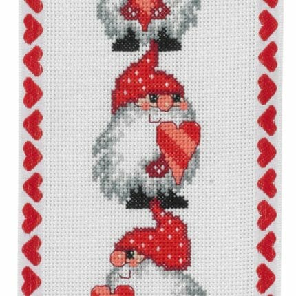 Kalender med nisseneungene som leker på taket er brodert med Moulinegarn.