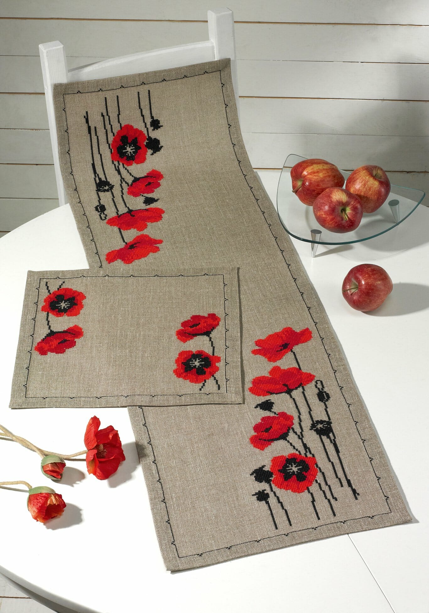 Nydelig Valmue løper brodert på natur Lin 8/18″ med Perlegarn.