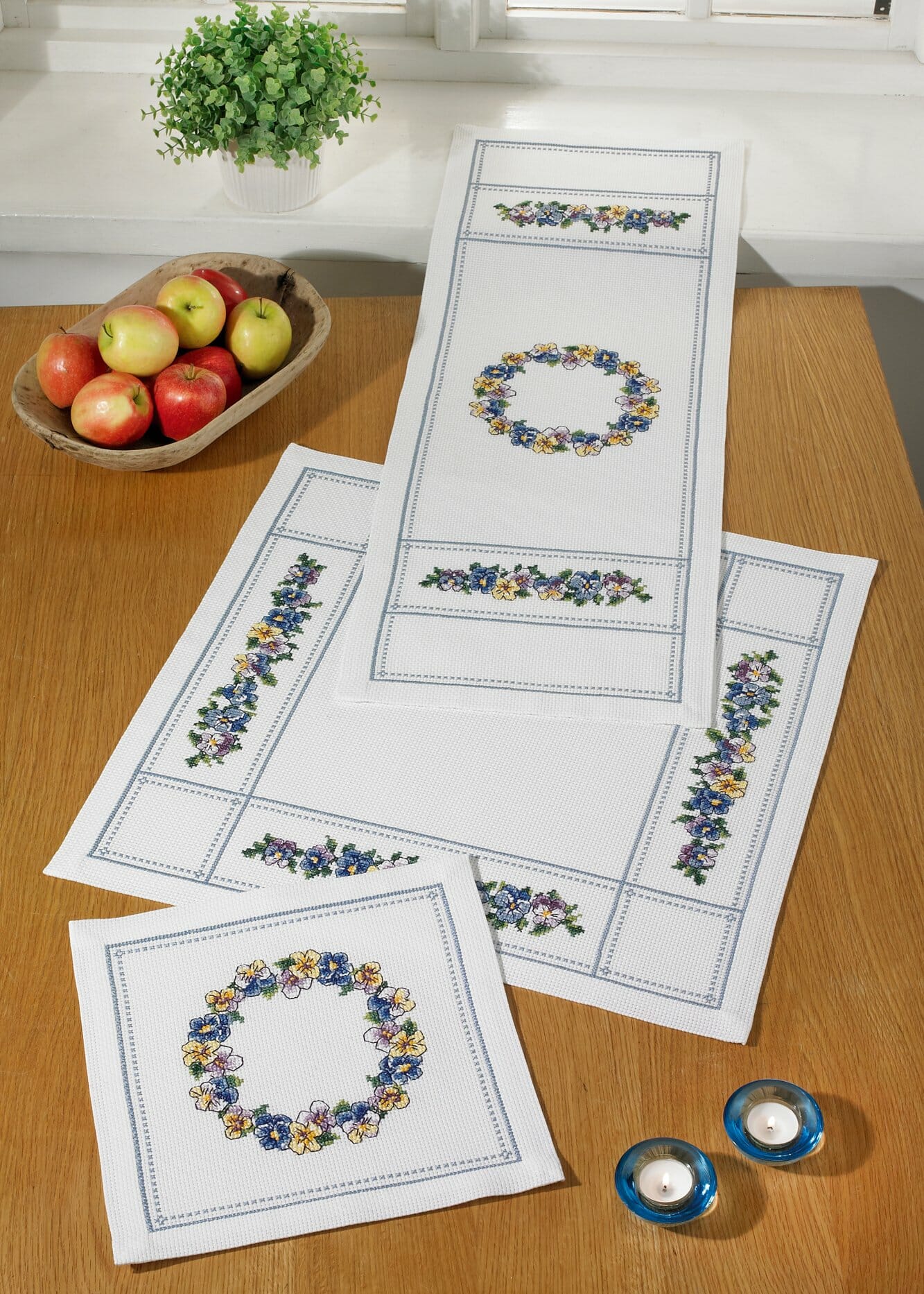 Nydelig duk av Violer broderes på hvit Aida 3,2/8″ med Perlegarn.