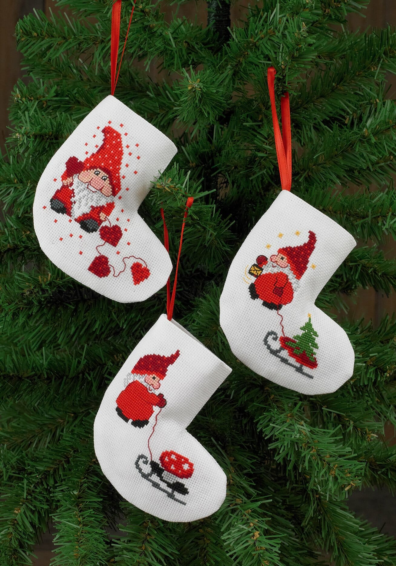 Nisse pynt til juletreet x 3, borderes på hvit Aida 7,2/18″ med Mouline garn.
