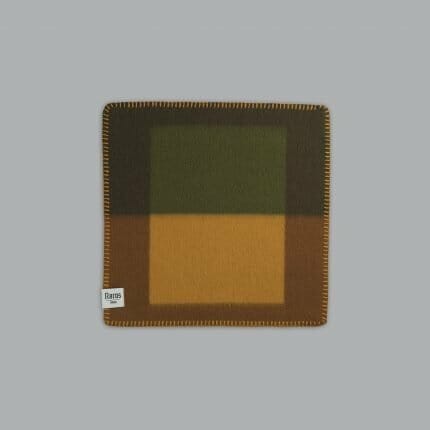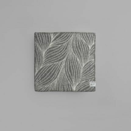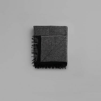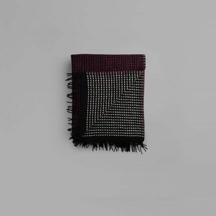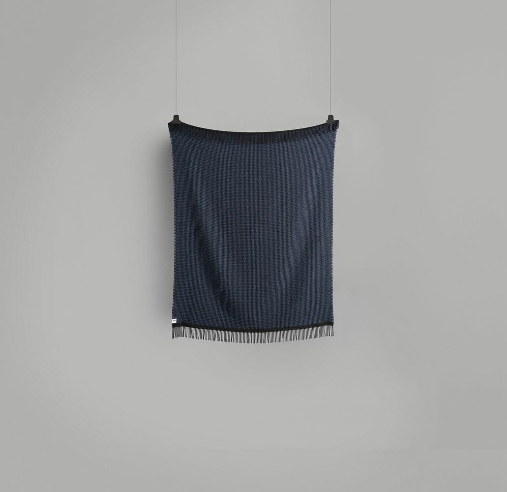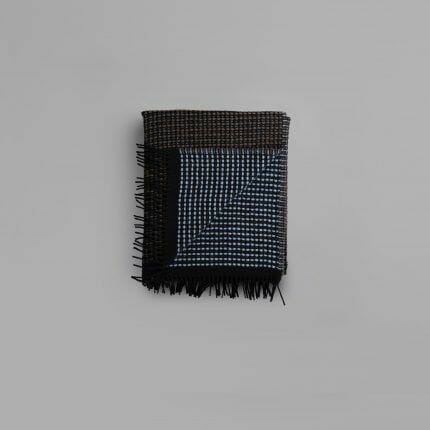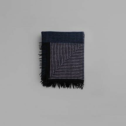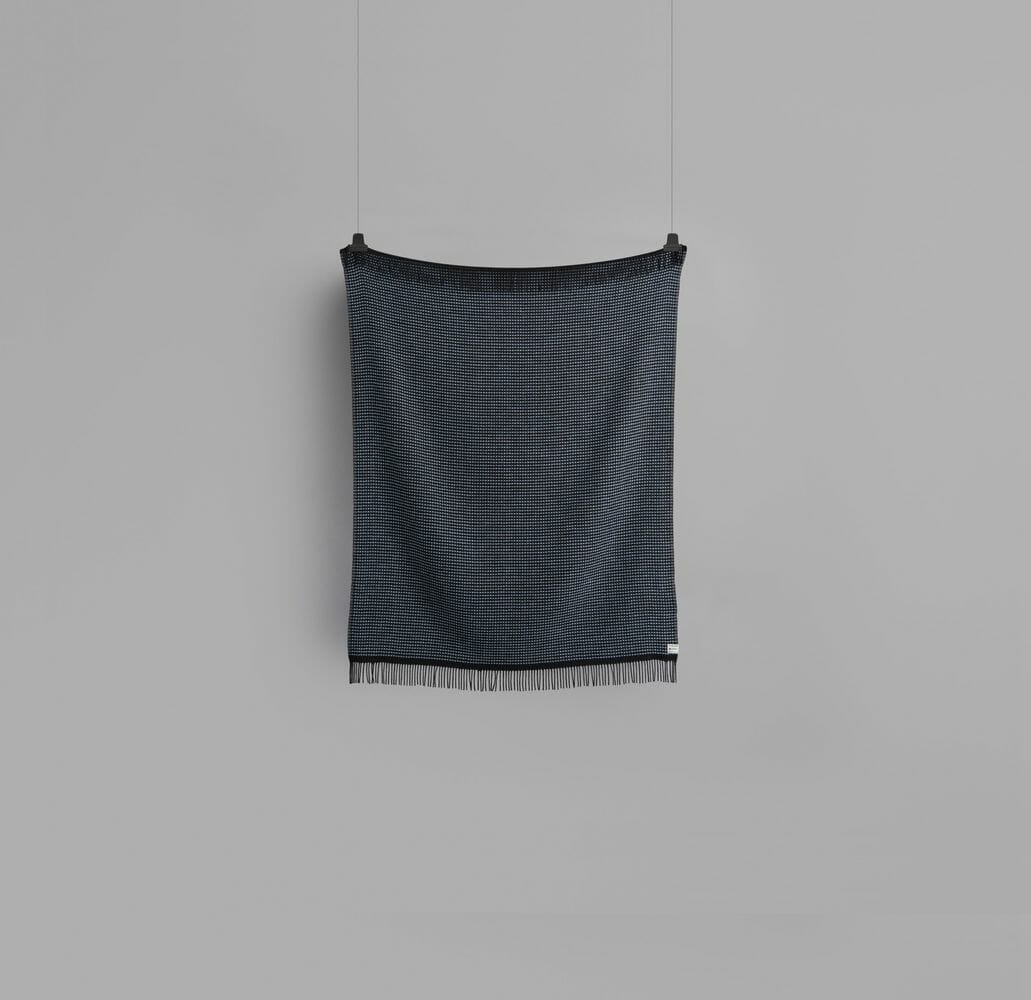 Lofoten er en videre utforsking av de tynne kvalitetene i norsk lamull. Vi har jobbet med strukturelle bindinger som skaper mye volum og relieff i pleddet, og som ga oss muligheten til å jobbe med en tosidighet i fargesettingen: Lys blå mot en nøytral lær-farge. Mint-grønn mot burgunder. En lett syrin mot petroleumsblå. Vi kalte pleddet for Lofoten fordi det er blitt en barsk kvalitet som minner oss om grove gensere.