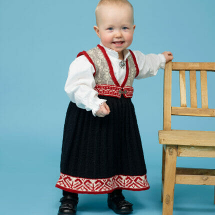 Denne flotte festdrakt-vesten vil gi din lille gutt en elegant og tradisjonelt look! Vesten strikkes i Rauma Finull, kjent for sin mykhet og holdbarhet. Vesten passer perfekt til enhver feiring eller anledning og vil gi et sjarmerende tilskudd til din lille gutts festantrekk. Med en rekke vakre farger å velge mellom, kan du enkelt finne en farge som passer til festantrekket.