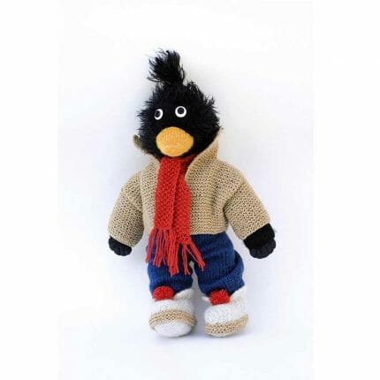 Snønissejente strikkepakke inneholder oppskrift, garn og ferdige nissekropp.