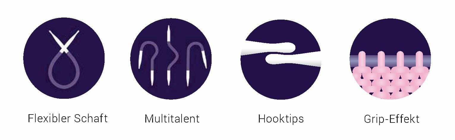 Ergonomiske strikkepinner med fleksibel kabel. Den kan bøyes slik som du ønsker. Som en krok å samle maskene, som en flettepinne, eller hva annet du måtte ønske. Tuppene er dråpeformede, men er like gode å fine å komme inn i maskene med, om ikke bedre.